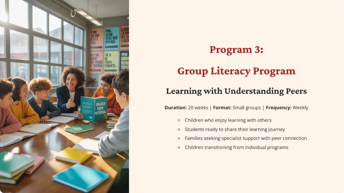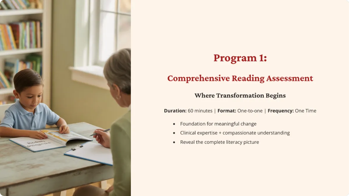 From comprehensive clinical assessment to intensive intervention, our programs address the real causes of reading struggles while building confidence and skill at every session.