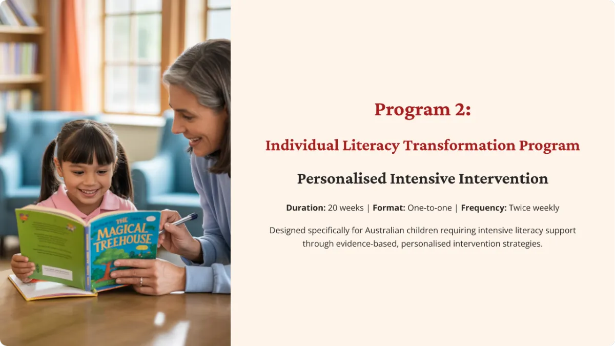 When school reading programs haven't worked, our T3 Intervention Method™ provides the clinical expertise your child needs. Our evidence-based approach addresses the root causes of reading challenges through intensive, individualised intervention with qualified reading specialist..